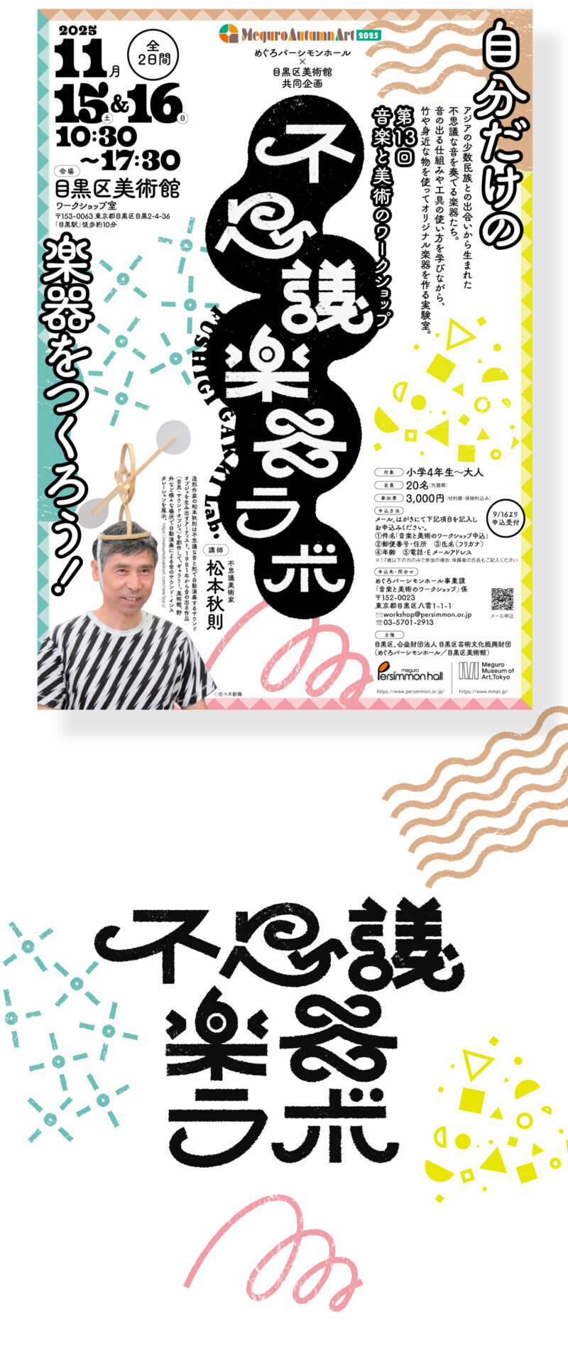 めぐろオータムアートで行われる、不思議美術家・松本秋則氏によるワークショップ「不思議楽器ラボ」のチラシデザインを担当しました。 空き缶や竹など身近な素材を使って、自分の手で自由に楽器を作ろう!というワイワイ・ワクワクするような、それでいて少し民族っぽい雰囲気を出しました。